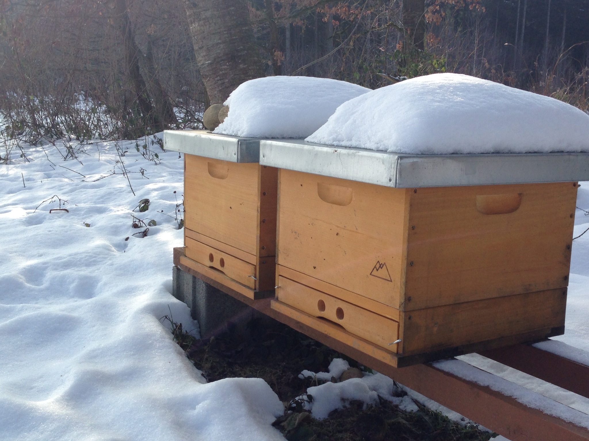 Wenn man bei beiden Beuten das Ohr an die Holzwand legt, hört man ein deutliches Summen. Ein gutes Zeichen!