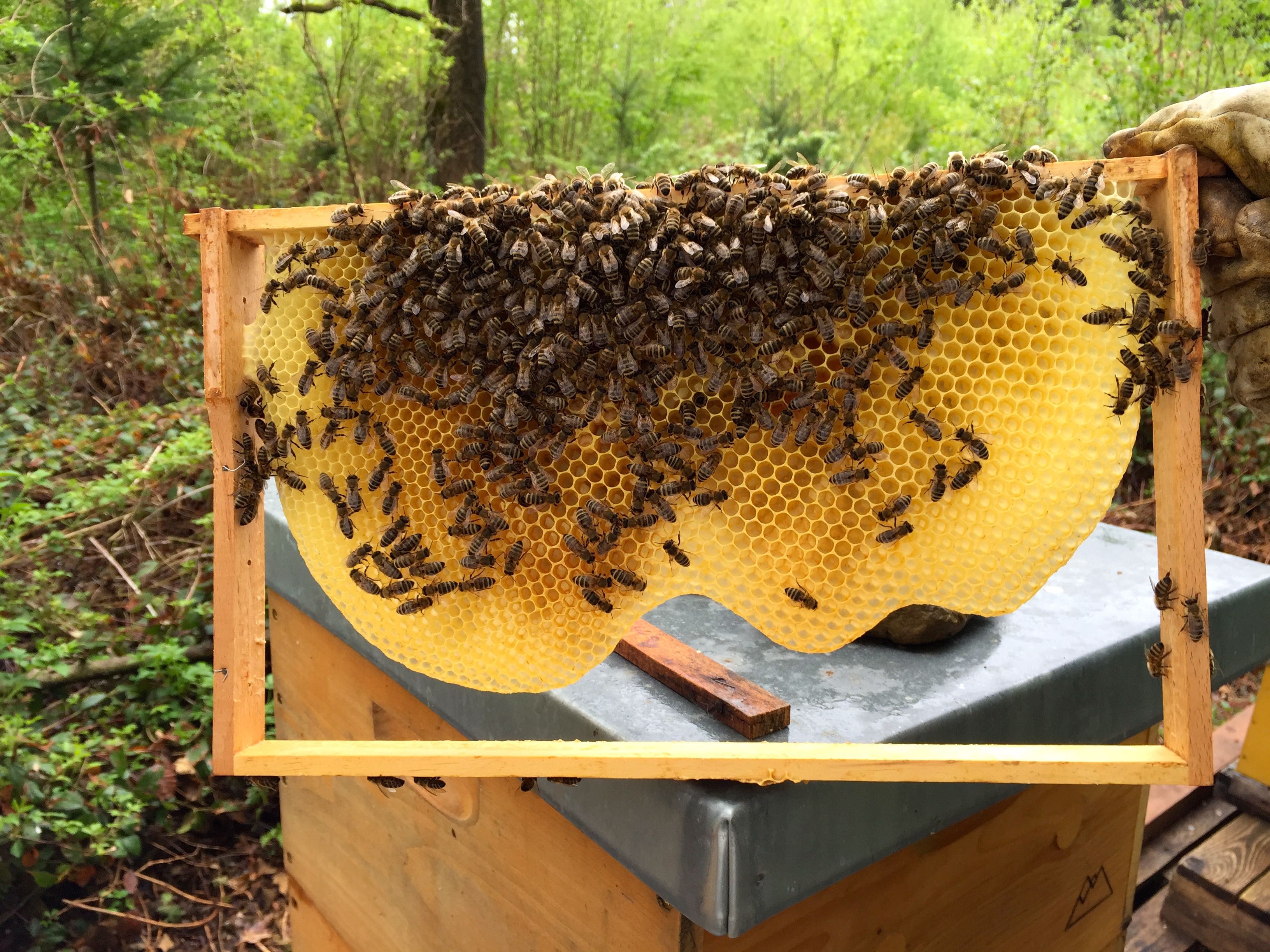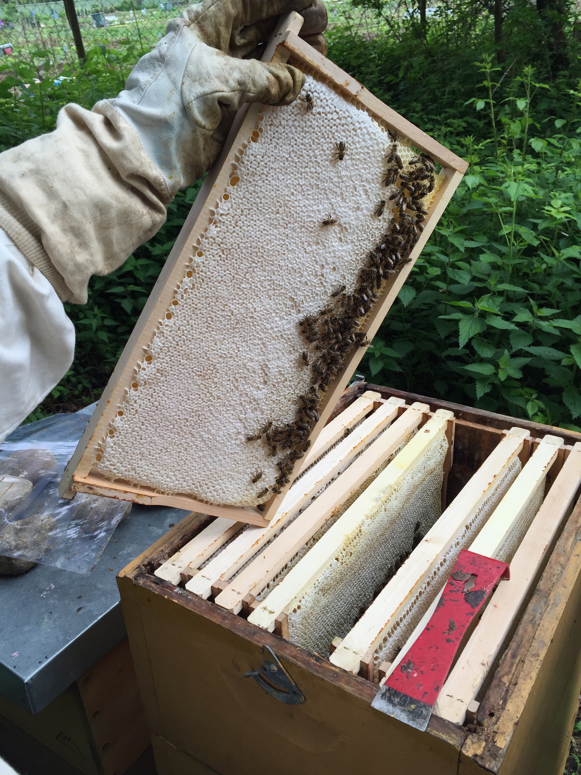 Die Bienen waren trotz des Regenwetters nicht untätig. Sie haben sich auf häusliche Arbeit konzentriert und den vorhandenen Nektar zu Honig verwandelt. Der Honigraum von Volk 3 ist voll. Es ist eine wahre Freude, die komplett verdeckelten, schweren Honigwaben in der Hand zu halten: