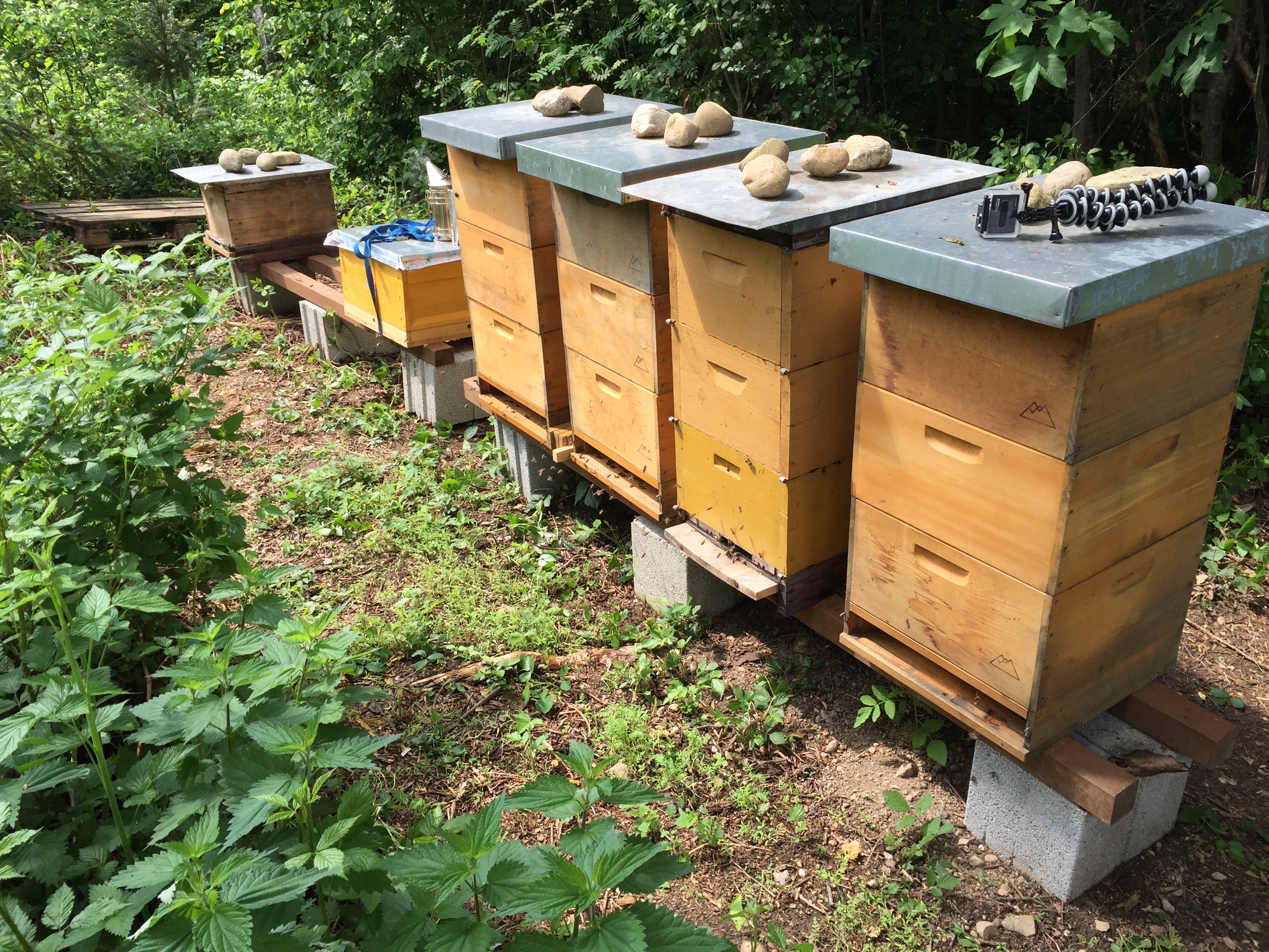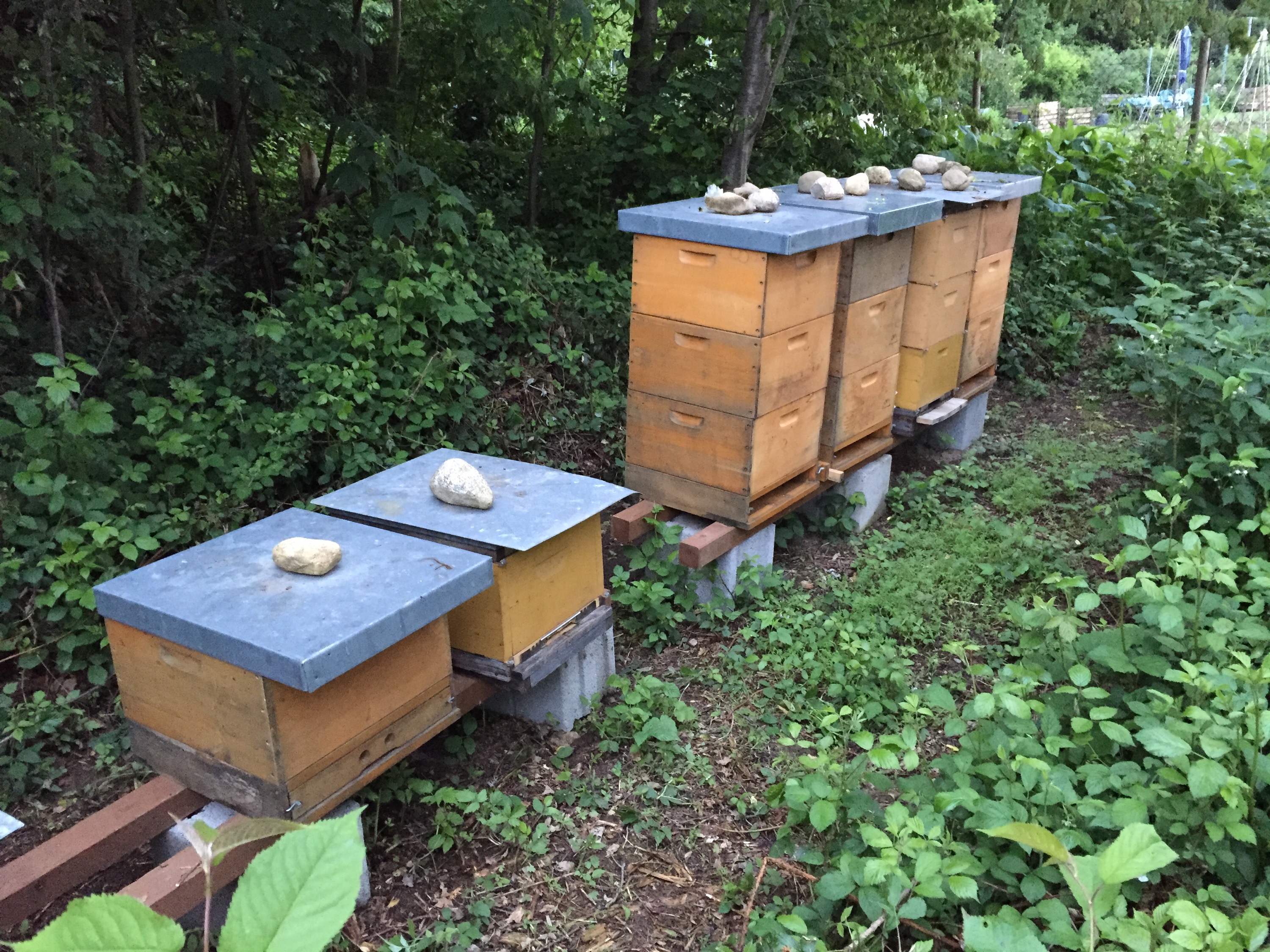Ansonsten habe ich die wuchernden Brombeeren etwas eingedämmt und ein zweites Gestell für weitere 4 Bienenkästen aufgestellt. Es besteht, ganz simpel, aus 3 Betonsteinen und zwei Holzlatten.